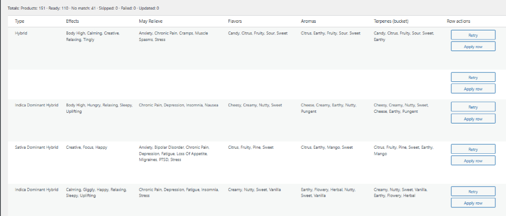 Save yourself hundreds of hours annually. With 2 clicks we match your cannabis products up with our database of over 15,000 strain profiles, and automatically import everything. Bulk import, or take it slow.